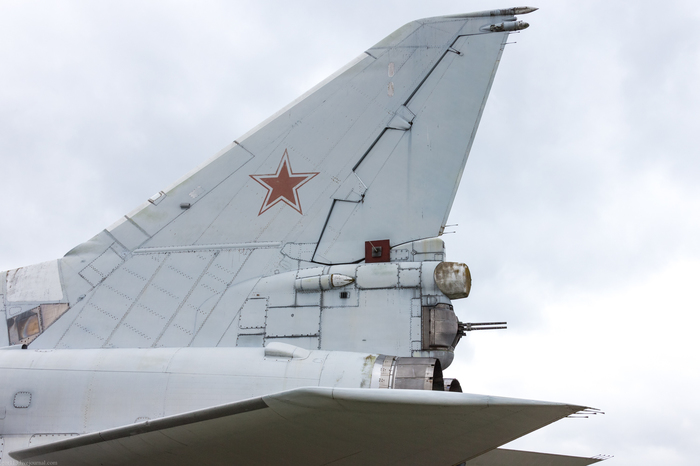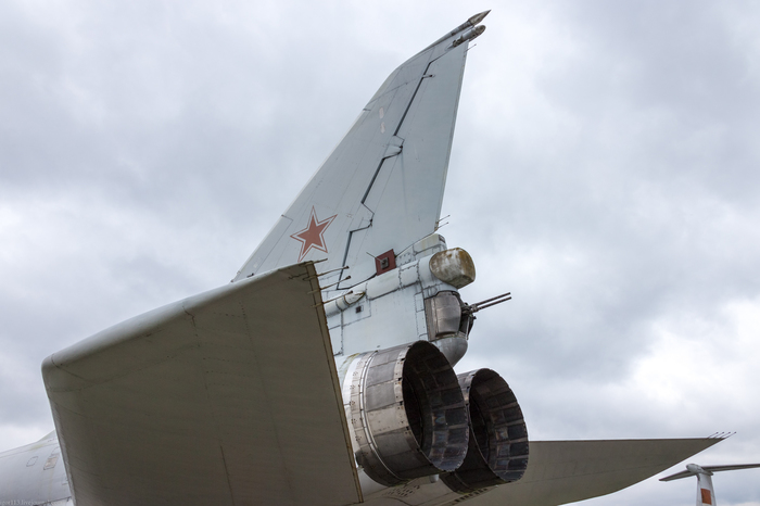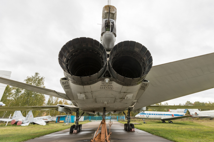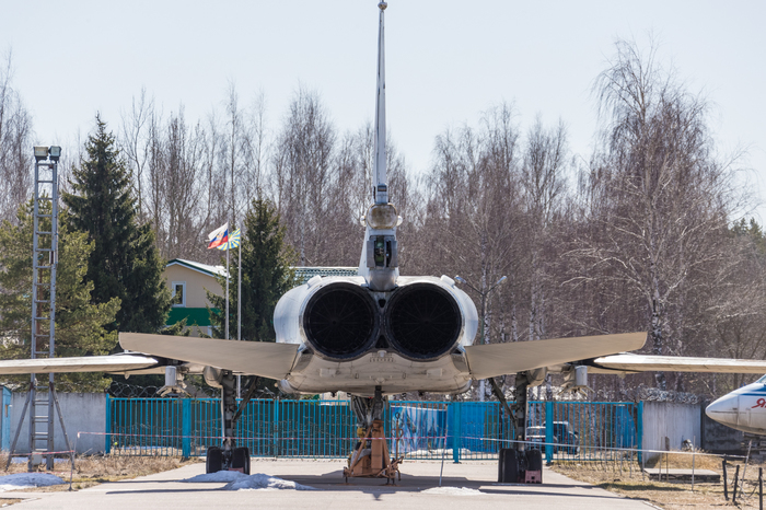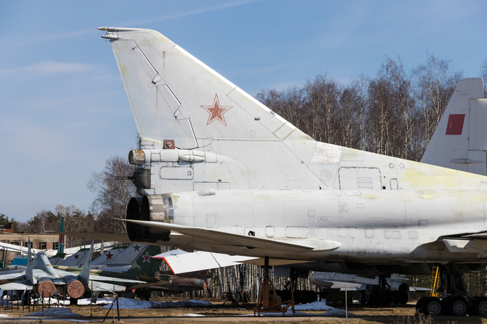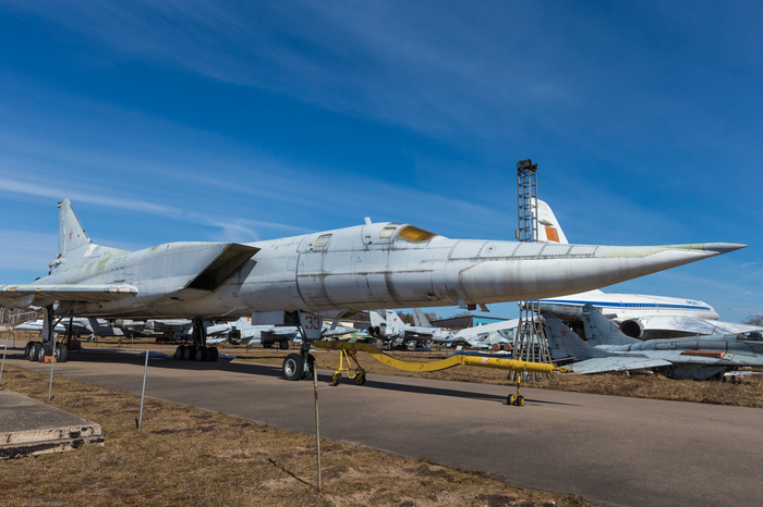 Это пятый, заключительный прототип Ту-22М3 1976 года выпуска с бортовым номером 33, заводским 4831328, серийным 31-02. Одновременно с Ту-95МС в музей с учебно-аэродромной базы ВВИА поступил бомбардировщик с крылом изменяемой стреловидности Ту-22М3. Это случилось в 2012 году. Самолет еще со штангой дозаправки. Из отличий от строевых самолётов - 4 держателя для пороховых ускорителей в районе окончания грузолюка.