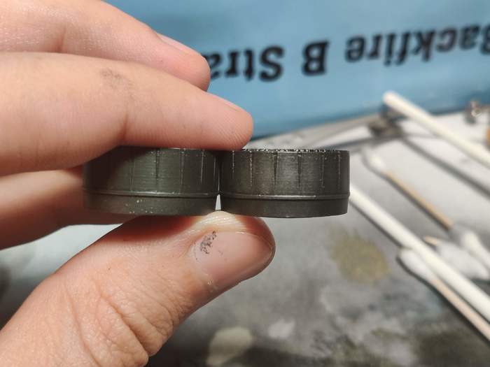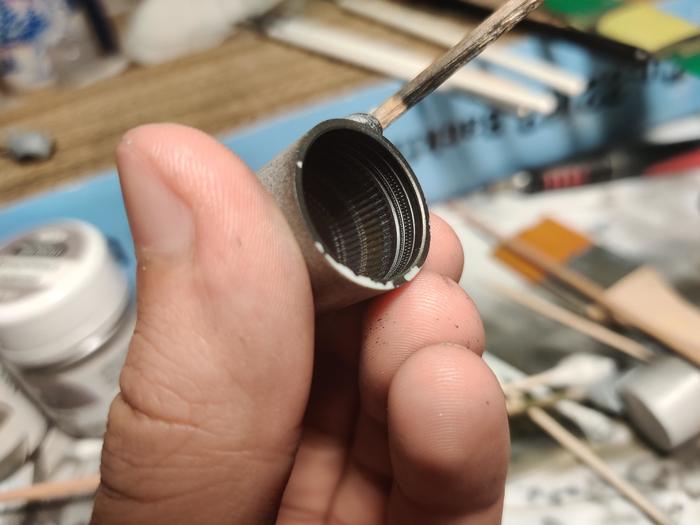 А вот и она! В начале использовал тамию, но она слишком быстро сохнет и тяжело оттирается. Перешел на ак, с ней как-то проще. Наносил толстый слой, давал высыхать и стирал почти до минимума еле заметного. А снаружи прошелся темной смывкой, выделив углубления. Убавил блеск и дал возможность для зацепа сухого пигмента при помощи полуглянцевого лака.