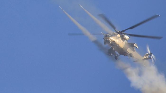 Иракский Ми-35М ведёт огонь НАРами в ходе войны против ИГИЛ