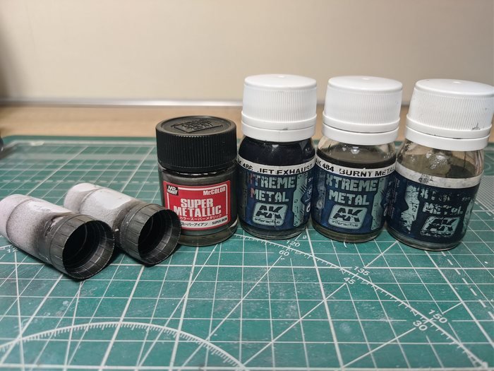 После черной глянцевой подложки, в ход идет базовый цвет металлика. В моём случае, использовал самый темный цвет, который был в наличии. Он мне всё равно показался светлым, поэтому покрыл еще черно-синим лаком от AK - Jet Exhaust. Хоть он и находится в линейке металликов, в этой банке нет ни грамма металлического помола, только цветной лак. Имейте это ввиду при покупке. Я вот хоть немного и лохонулся с ним, но применение нашел) И так же у настоящего прототипа имеется желтоватый оттенок горелого металла, Что я и сделал. А вот внутренние панели уже после манипуляций покрасил цветом ган метал.