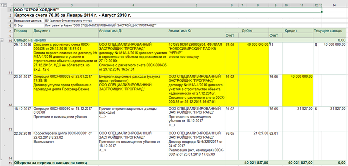 Так, с мая 2016 по июль 2018 года по фиктивным документам с ООО «Програнд» на ООО «Строй Холдинг» (ИНН 5408312069) было перечислено более 170 миллионов рублей. Из них 40 миллионов было возвращено в ООО «Програнд» в виде якобы уже легальных инвестиций в недвижимость.