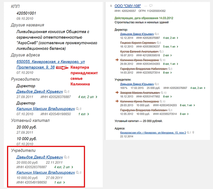 Директором и учредителем ООО "СМУ-108" была Калинина Ирина Леонидовна – законная супруга Андрея Калинина. На момент поступления Калинину денежных средств директором и учредителем ООО "СМУ-108" являлся Давыдов Давид Юрьевич, у которого ранее была совместная фирма ООО "АгроСнаб" с Максимом Калининым – младшим братом Андрея Калинина.