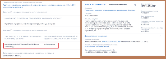 Например, в ноябре 2018 года ООО "Програнд" получило от Администрации Кемерово госконтракт на сумму 137 миллионов рублей на строительство детского сада. Однако, в конкурсе участвовало единственная фирма ООО "Програнд", что является нарушением Федерального закона № 44-ФЗ.