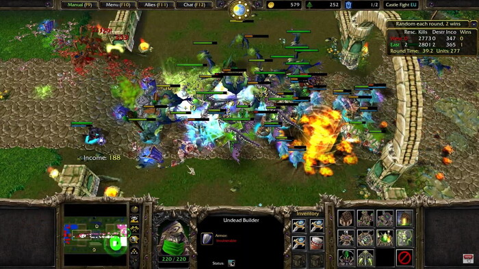 Castle Fight - моя самая любимая карта в WarCraft, где 2 противоборствующих стороны пытаются разрушить друг другу крепость. Можно играть 1-1, 2-2 или 3-3. В руках игроков есть рабочий (на выбор из нескольких фракций) и рабочим можно строить разные здания. Из зданий выходят монстры которые уже без участия игрока воюют друг с другом. Также можно строить вышки, экономические, магические здания. У каждой фракции они разные. Добавьте ко всему этому большое количество стратегий и фишек, которые присутствуют в игре. Получается убойная смесь.