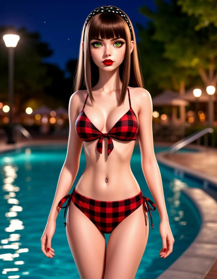 антропоморфная, 19-летняя девочка с коричневыми длинными прямыми волосами с короткой чёлкой, губы Красной помадой тёмно-зеленые глаза, черный ободок с маленькими белыми горошками, стройная фигура, красная клетчатое завязанное бикини, стройные ноги , пупка в красных пирсингах, под ножкой, гуляют в аквапарке, ночью