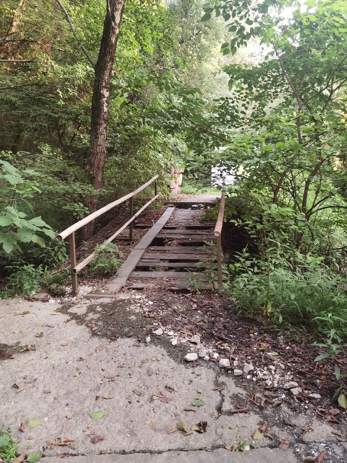 Почти сразу нас встретили множественные полянки. Наклон есть, но это не страшно. Решили пройти по карте до беседки. Перешли ручеек, затем вышли к навесному мосту. В темноте было вообще непонятно, через что мы проходим, но на карте предупреждающе стояли значки обрывов и устрашающее название каньона "Чёртовы ворота".