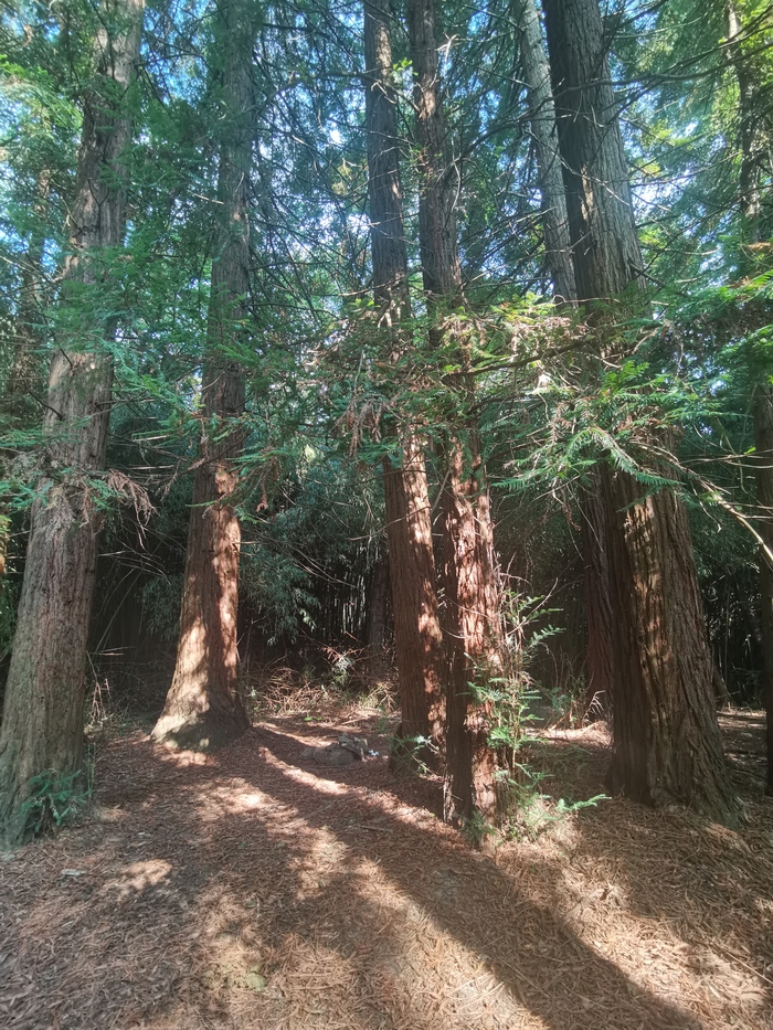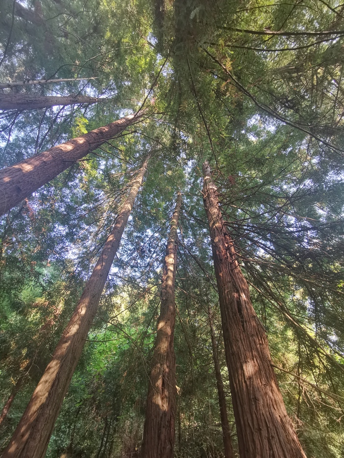 Дальнейший путь лежал через очередную достопримечательность. На карте она помечена как "роща секвойи". Когда о них заходит речь, то представляются широченные и высоченные гиганты, но здесь это были обычные хвойные деревья. В любом случае, в косых лучах солнца они выглядели очень красиво.