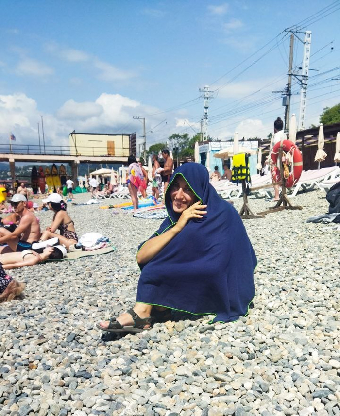Народу, в общем, было немного, но к моменту, как нам пора было уходить, все подтягивались. Дул достаточно сильный ветер, так что в тени было прохладно, но солнце жарит. Так что по ходилось кутаться в полотенце и уже так сидеть на солнце, чтобы и тепло было и не обгореть.