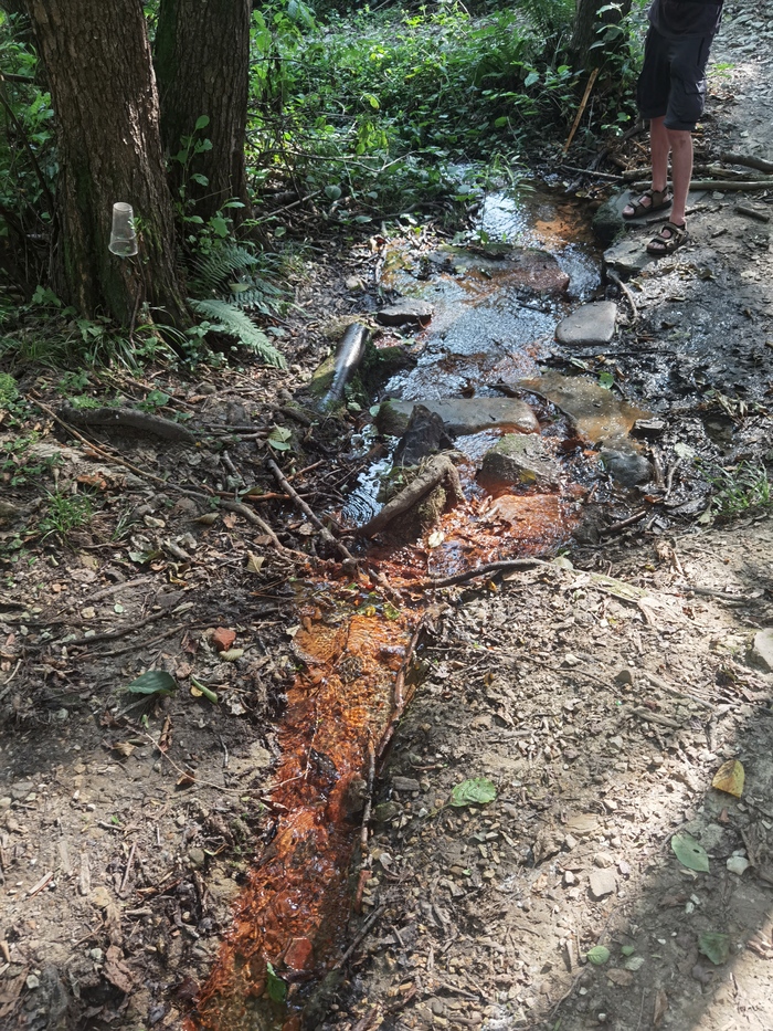 Время шло, солнце жарило даже в тени деревьев. Запасы воды на исходе и нужно было пополнить. Так как магазинов по пути нет, заходим на родники, также указанные на карте. И ближайший был железистым. Сначала думали, что это фигурально, но когда дошли до ручья, увидели, что камни, контактирующие с водой, будто заржавели, а вода имеет характерный привкус. Пока набрали воду в этом месте, дальше должен быть второй родник, но полностью доверять карте нельзя.