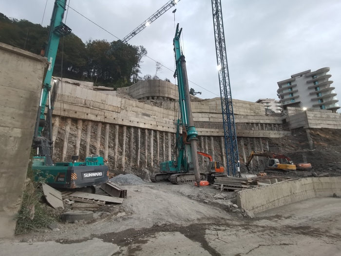 Преодолев, наконец, длительный и извилистый спуск, мы вышли к какому-то сооружению. Даже вблизи не смогли понять, вырезают ли колонны из камня или отливают их из бетона сверху. Интересно было бы увидеть и конечный результат.