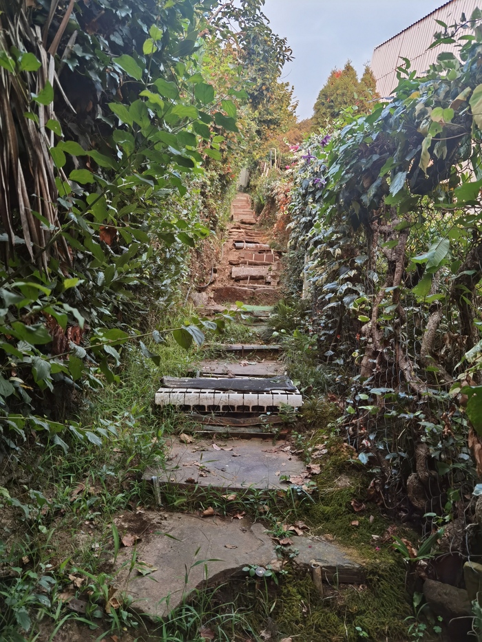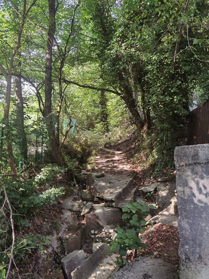 Наконец, дорога нас вывела к Хосте. А там снова вдоль дворов и садов. Не природная тропинка, конечно, но лучше, чем трасса или любая дорога, как по мне. Узенькие улочки, окружённые растительностью и деревьями. Непонятно из чего сделанные ступени на лестницах. Очень атмосферно, как по мне. Из новых необычных растений увидели киви. Твердый как кирпич, так что полакомиться не удалось.