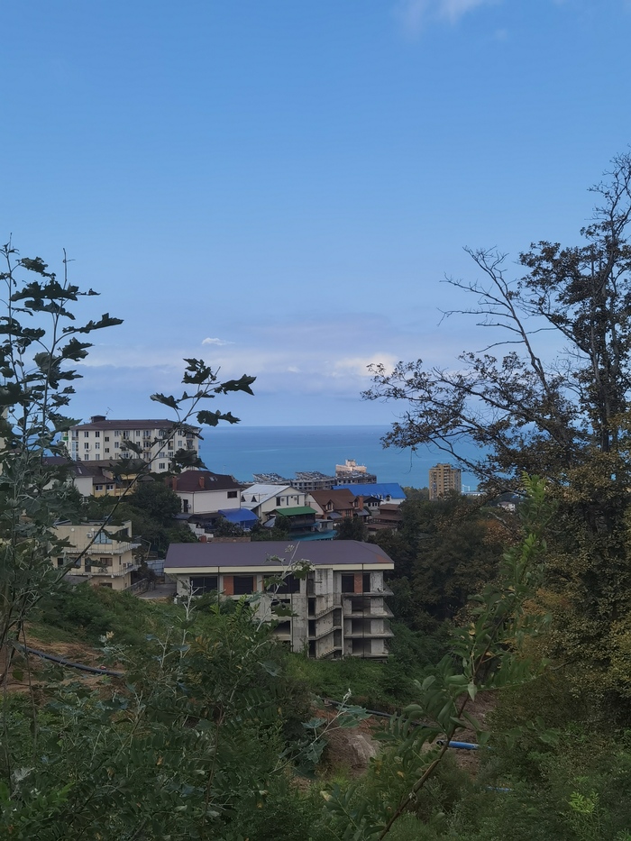 Наконец, вышли к морю. Невольная улыбка не сходила с моего лица. Солнце бликует, волны плещутся. Красота. Вот только этот пляж оказался местом для туристических туристов: объявления о "покататься на уточке", "рыба, раки, креветки", "антицеллюлитные катамараны", "экскурсии в Абхазию" и т.д. Портило атмосферу, преграждало вид и вообще создавало лишний шум. Не понравилось.