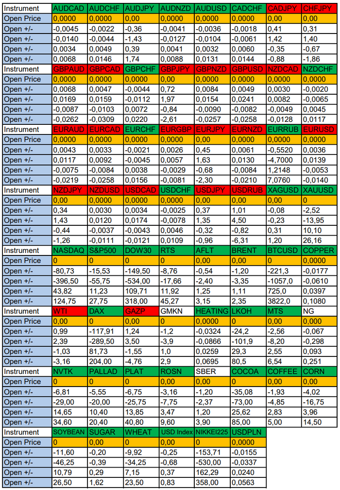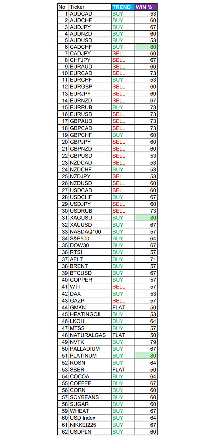 Весь перечень анализируемых активов указан ниже в общем количестве 62 инструмента. Здесь Вы найдете активы рынка Форекс, популярные активы Московской биржи, не менее популярные активы Чикагской биржи СМЕ и мажор криптовалютного сегмента - Биткоин, за которым следуют все альткоины.