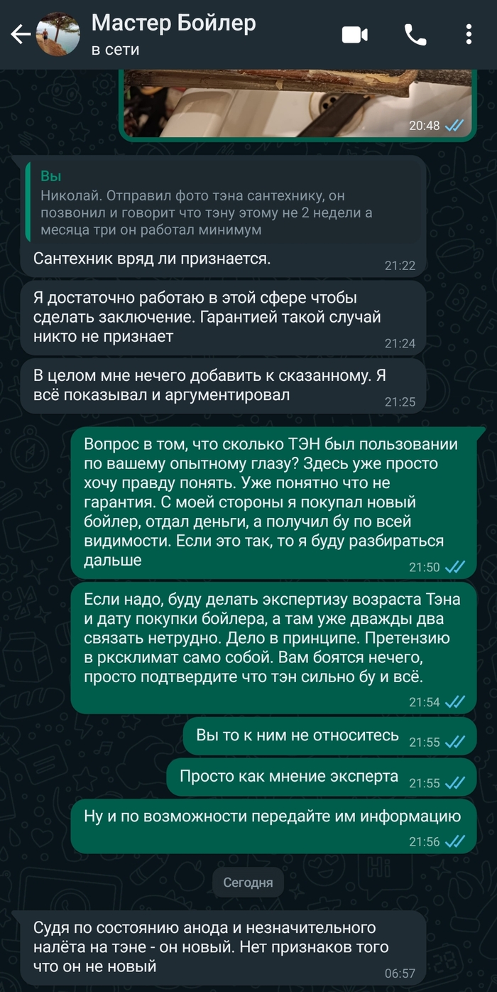 Здравствуйте, господа. 3 апреля купил на озоне бойлер ballu rodon на 30 литров. Мечтал о нем долго, так как хотелось не зависеть от сезонных отключений горячей воды. Долго решался, вроде бы вещь нужная и ненужная одновременно. Воду выключают не часто, но как минимум пару раз в году на пару недель. Квартира новая, при ремонте были заложены коммуникации для бойлера на будущее. Прошло 4 года с момента покупки хаты, все таки решил купить долгожданный водонагреватель. Приехал он в озон через неделю, где то числа 11 я его забрал, при первом осмотре визуально все вроде нормально, новый, были сверху пару небольших сколов краски, едва заметных. Зная озон, все надо проверять тщательно, так как часто можно напороться на товар который уже юзали и вернули обратно, якобы не подошёл. Установку решил доверить сантехнику из управляющей компании дома. Бойлер ждал установки неделю, специально выделил выходной, взял отгул. 17 апреля сантехник мне его установил, за 2к. Все по правилам, как положено, единственное что при ремонте, коммуникации, ремонтники установили под гибкие шланги, аккуратно подвели выводы в короб, где спрятаны все трубы. Но спустя время я понял, что гибкие шланги не хочу, хочу стекло холст трубы пластиковые. Сантехнику пришлось паять, он это сделал. В итоге бойлер повешен, коммуникации подведены, все эстетично. Первый пуск, все как положено. Перекрыл горячую, открыл подачу холодной в бойлер, бойлер наполнился, открыл вывод горячей из него. Открыл смеситель, выгнал воздух, пошла вода, потом только в розетку и включение. Все вроде верно? На том он ушел, забрав деньги. Я, убедившись что вроде все работает, вода шла чуть теплая. Выключил все в обратном порядке, так как горячая вода центральная была и выключение ее было намечено на 26 апреля. Я со спокойной душой забыл про него. 25 вечером, решил включить бойлер, накануне отруба горячей воды. Все как и написал ранее, проделал как и должно быть. Пошла теплая вода, через час уже горячая. Вечером все помылись, я мылся последним спустя два часа после супруги, за это время бойлер должен быть по-любому нагреть полный бак до 60-70 градусов (максимум 75 по инструкции). Крутилка была почти на максимум. Когда мылся сначала шел кипяток, на смесителе пришлось добавлять холодную, я в общем то был рад, думал что вообще из горячего крана будет идти теплая вода чуть может горячеватая, но здесь кипяток, а значит и расходоваться бак будет медленнее, если мешать с холодной. Мылся минуты 3, начал замечать, что горячая вода начала остывать, и из полностью горячего крана шла уже теплая, а не кипяток. Расстроился так как подумал что быстро кончилась в баке вода и бойлер ещё не успел нагреть новую порцию. Мало 30 литров. Но что то больно быстро как то она кончилась. Мылся минут 5 от силы. Вышел из ванны, смотрю а лампочка на бойлер не горит, значит нагрев не идёт, что странно. Покрутил до положения Off, раздался щелчок на крутилке, заново включил, опять щелчок, как и должно быть, но лампочка не горит. Думаю что за нах? Вода в бойлер есть, течет уже просто холодная, не греет. Время было уже поздно, пошел спать. Ну думаю за ночь нагреет. Наивный. С утра встаю, вода холодная, горячую уже в доме выключили. Бойлер не издает признаков жизни. Лампочка не горит вообще. Вынул из розетки, пошел выключил автомат под бойлер, включил, снова не работает. Понятно. Я звоню сантехн