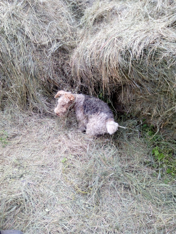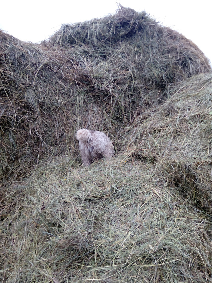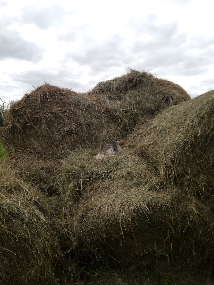Родителям привезли сено в рулонах. Стали мы его укладывать на сеновал. Мой пёс, естественно не остался в стороне.