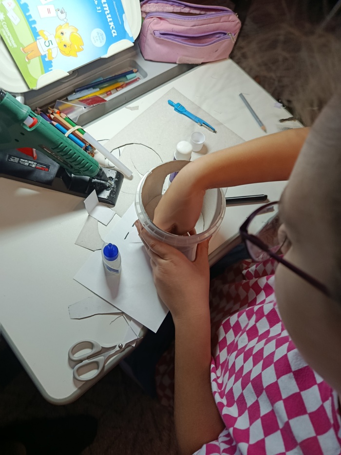 Всё дочка делала сама, за исключением операций по сверлению отверстий и операций с канцелярским ножом.