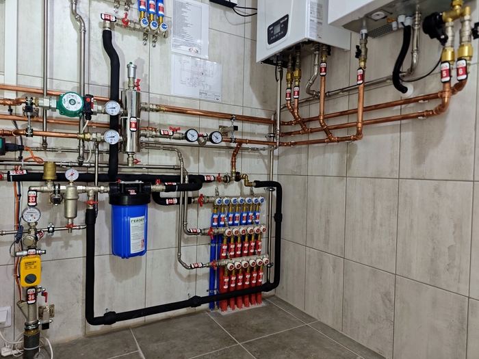 Ну что ж, погнали выкладывать совсем бомбические, на мой взгляд, котельные в сочетании гидравлики медь(отопление) + нержавейка(водоснабжение). На подходе ещё две.