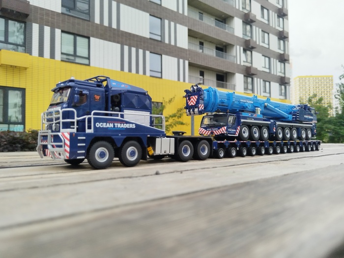Перевозка крана Liebherr LTM1500-8.1 грузоподъёмностью 500 тонн на модульном прицепе Sheuerle. Масштаб 1:50.