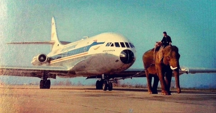 3. Внезапно буксировка Sud Aviation SE-210 Caravelle III авиакомпании Thai Airways при помощи слона. 1970 год.