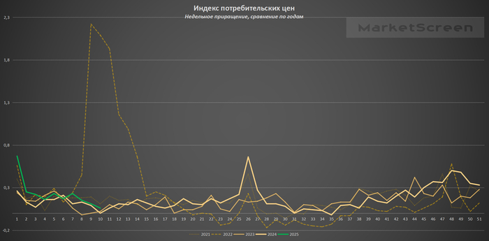 На неделе с 11 по 17 марта 2025 года инфляция продолжила замедляться и составила 0,06%.