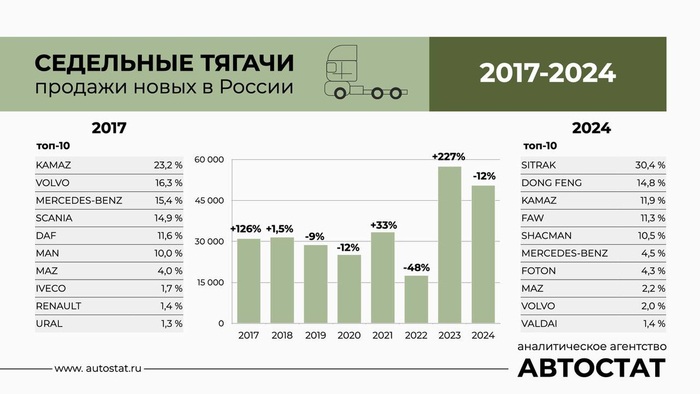 Подоспела новая статистика от Автостата. Сравнивают продажи новых седельных тягачей в 2017 и в 2024 годах. Говорят, европейскую «Биг7» сменила китайская топ5.