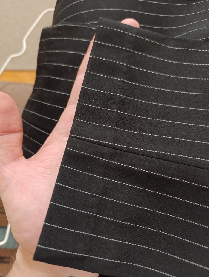 Вниманиие вопрос, является ли то, что на фото, косяком? Да, я отдаю себе отчёт в том, что, в том месте, где появился новый шов, будут заметны какие-то следы, это так. Вопрос именно к грёбаной полоске, которая образовалось, как мне думается, из-за нарушения температурного режима обработки (я ещё попросил отпарить брюки, хотя особой необходимости не было, один хрен придётся переделывать теперь самому).
