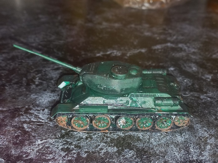 У меня было большое желание создать побывавший в боях танк, обстрелянный, со сколами и отверстиями от снарядов, а не лоснящуюся модельку со свежей краской. Получилось неплохо для первого раза, но не совсем то, что я хотел, буду учиться дальше.