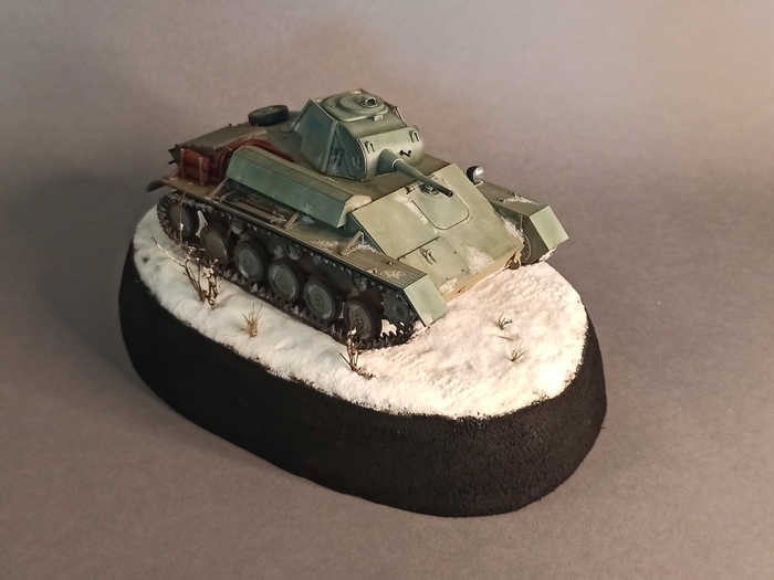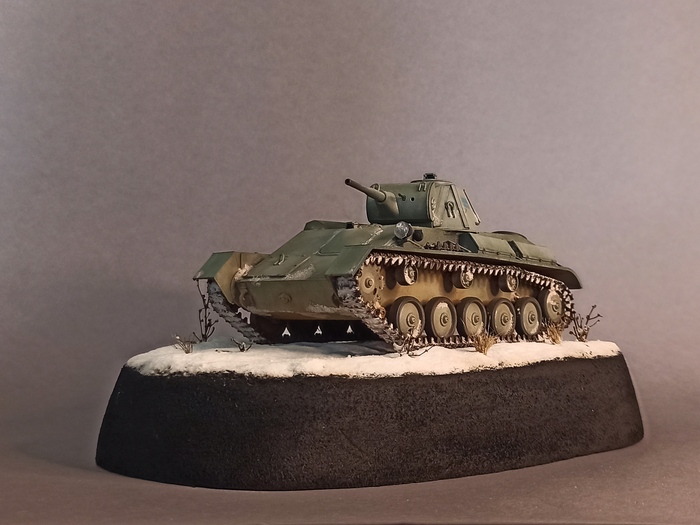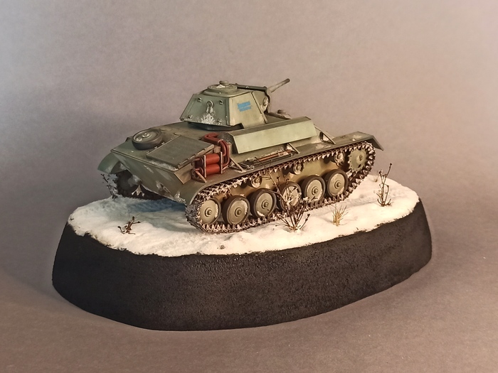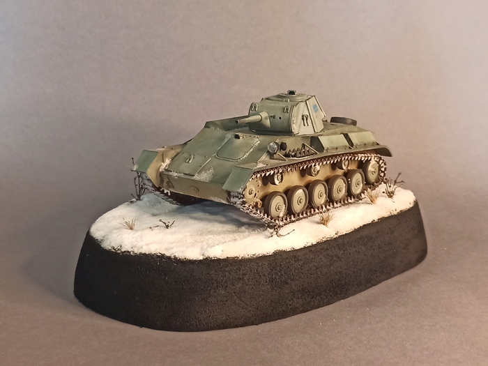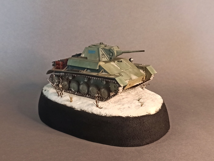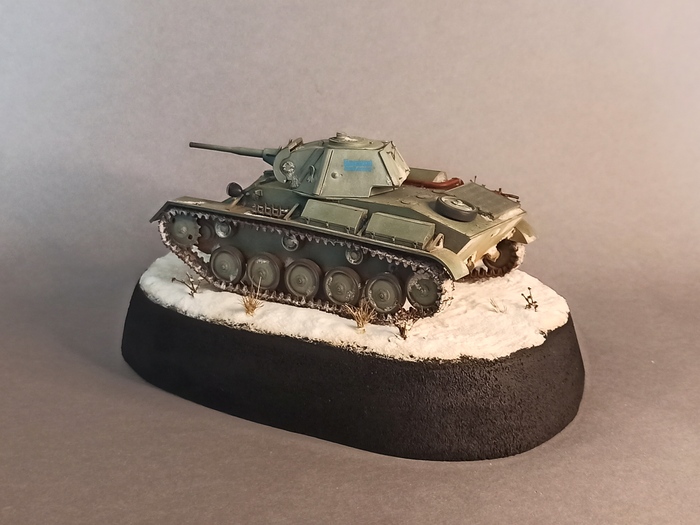 Окраска стандартная, для зимнего камуфляжа выбрана смываемая белая краска от "Армы". Подробнее об этапах окраски в конце поста. Танк планировался запачканный, а это значит, что обязательно должна быть подставка под виньетку/диорамку. Вырезал нестандартной формы подставку из пеноплекса. Зашкурил, размазал по ней смесь земли, гипса, воды и песка. Придал данной смеси рельефа. Окрасил, присыпал пигментом и дал высохнуть. Далее нанес слой ПВА и присыпал все содой - слой получился под слегка грязный снег, т.к. пигмент через ПВА просочился в соду - как и планировалось. Закрепил данный слой лаком для волос. Потом высадил небольшую "растительность" из сантехнического льня и сухостоя и нанес второй слой из соды (в том числе и на растительность), и снова закрепил слой лаком для волос.
