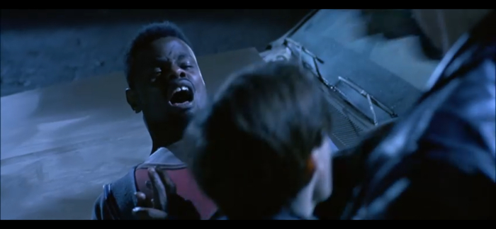 Одна сцена долго не выходила у меня из головы — эпизод на парковке, где Джон громко спорит с Т-800 о спасении его матери, Сары Коннор. В какой-то момент Терминатор резко хватает его и удерживает в железной хватке. Джон начинает кричать, звать на помощь, так как не может вырваться из его железной хватки.