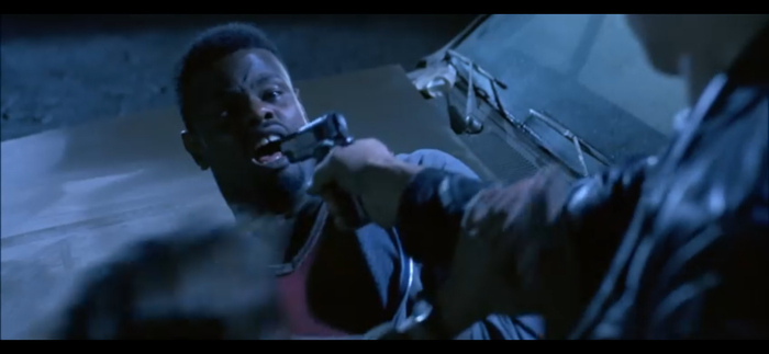 Терминатор моментально выполняет команду: одного он хватает за волосы и поднимает, а второго скручивает и наводит на него пистолет и собирается его пристрелить.