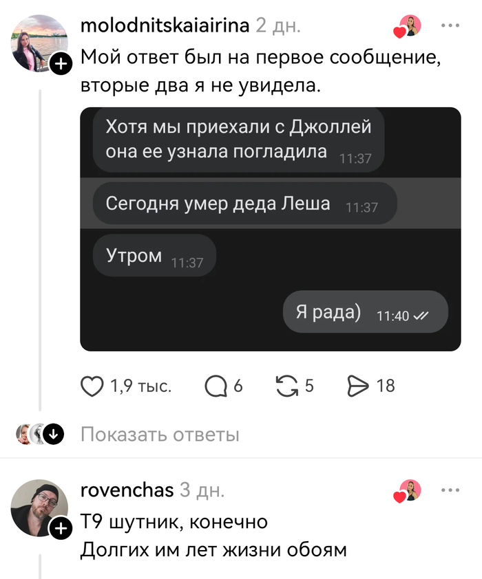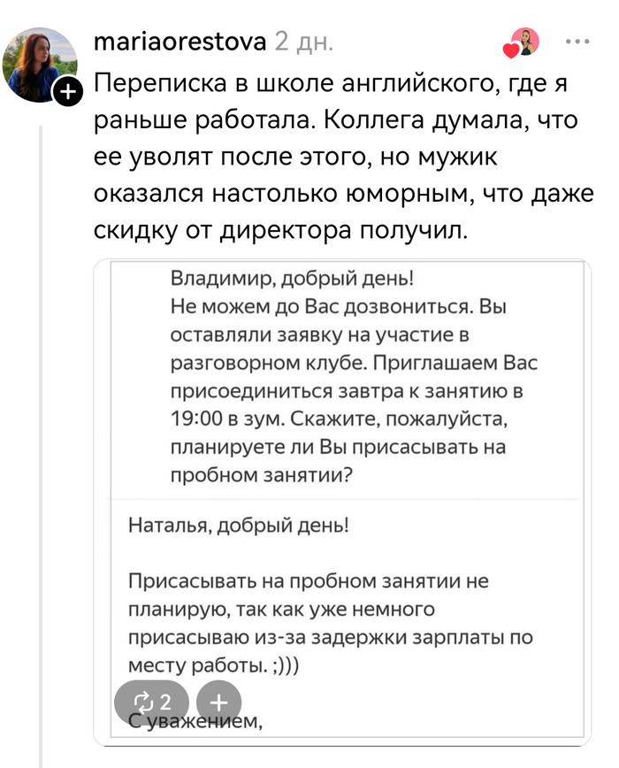 А потом смотрю — а менеджер последнее сообщение отредактировала. И там теперь не «приятно». Там теперь «принято». То есть она опечатывалась все это время. И приятной меня не считала.