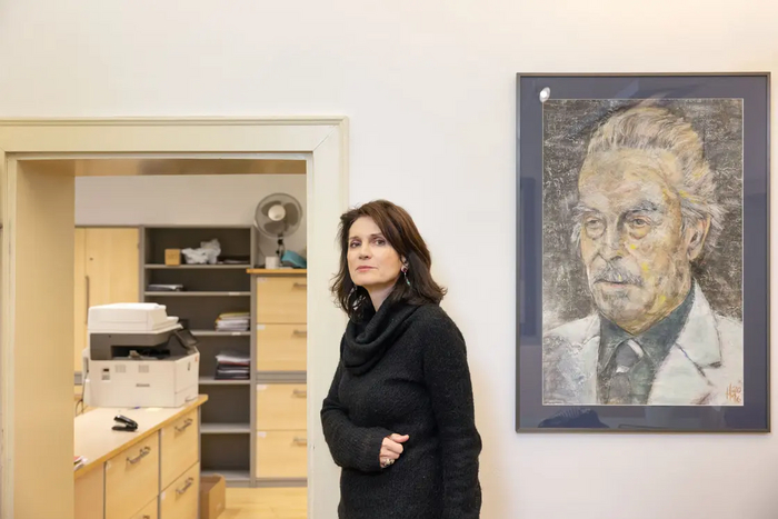 Адвокат Астрид Вагнер возле портрета Йозефа Фритцля