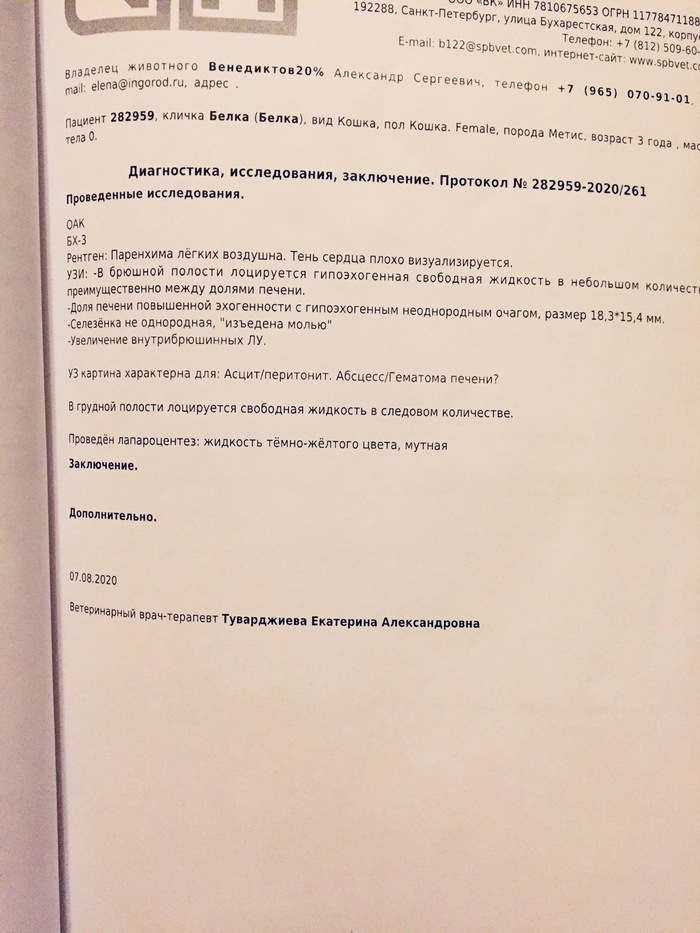 Продолжение поста «Заболела наша Белка, подобранная на улице. Жидкость в брюшной полости и гематома печени. Завтра вечером будут готовы анализы»1