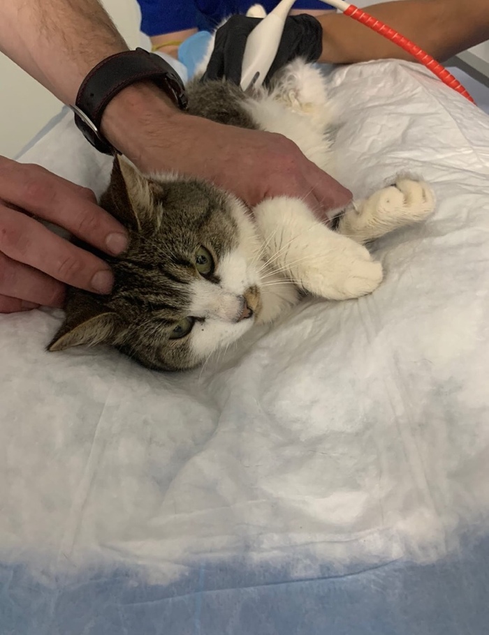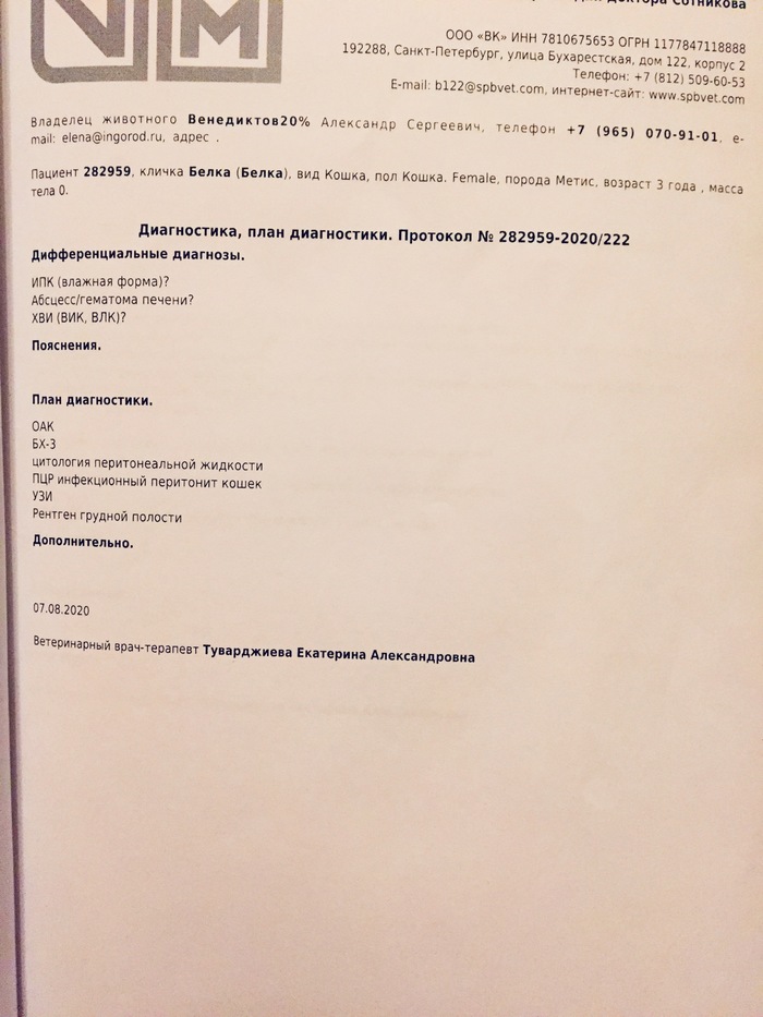 Сегодня @LazyMouse26 повезла Белку в клинику на обследование. Сделали УЗИ, рентген, откачали жидкость из живота (100 мл). Увидели небольшое количество жидкости в легких. Жидкость отправили на два анализа - ФИП и на бактерии. Завтра вечером будет готов результат.