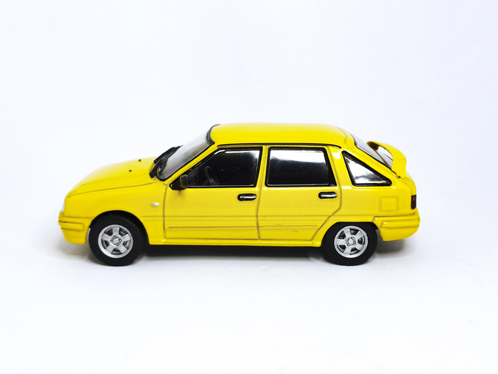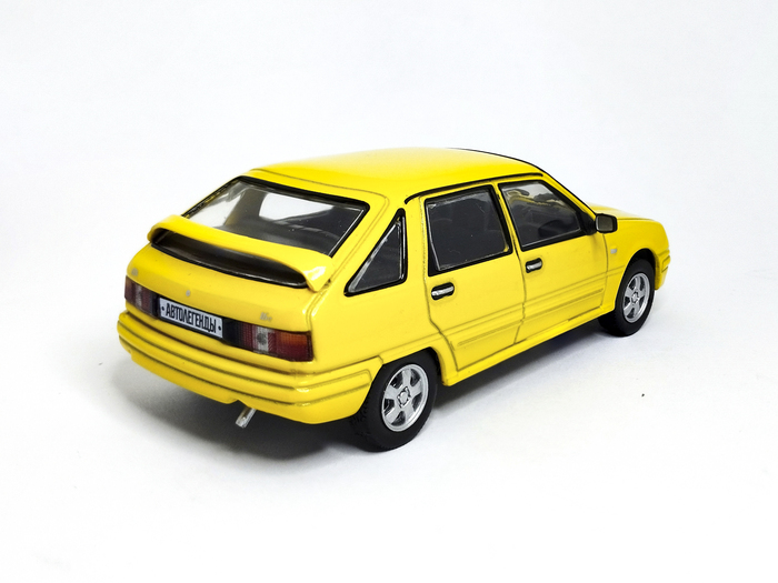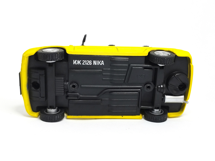 Глядя на эту модель, появляется ощущение, что это конверсия частного мастера, выпущенной ещё в серии "Автолегенды СССР" модели ИЖ-2126 "Ода". На первый взгляд может показаться, что производитель использовал смывку в зазорах между дверьми, капотом и кузовом, чтобы придать модели реалистичности. Но скорее всего была использована более тёмная подложка, поверх которой и нанесли жёлтую краску. На моей модели под передней правой дверцей краски затекло очень много и эффект реалистичности на локальном участке пропал. Но это легко исправить - смывку в зубы и вперёд!