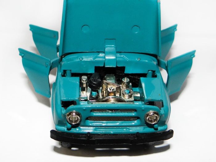 А вот у ИЖа донышко выглядит очень уж простенько. Глушитель выделен серебрянкой, а сзади имеется углубление багажника под запасное колесо, сквозь которое походит один из винтов, фиксирующих дно к кузову.