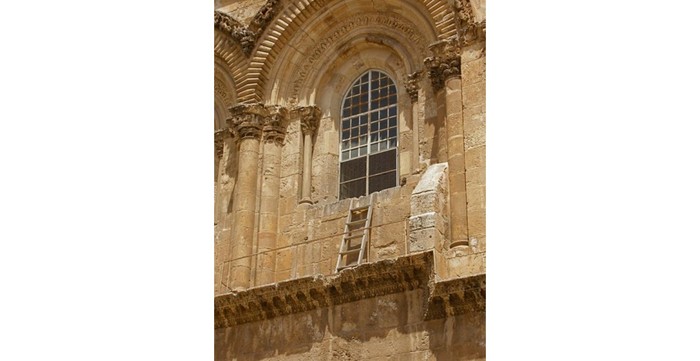 В Храме есть «Недвижимая лестница» - деревянная лестница, приставленная к правому окну второго яруса фасада Храма Гроба Господня (на фото). Лестница опирается на карниз, принадлежащий греческой Иерусалимской православной церкви, и приставлена к окну, которое принадлежит Армянской апостольской церкви. Лестница стояла уже в 1728 году и стала символом соглашения «не двигать, не ремонтировать и не изменять ничего в храме без согласия всех шести конфессий, владеющих храмом: греко-православной, католической, армянской, коптской, сирийской и эфиопской».