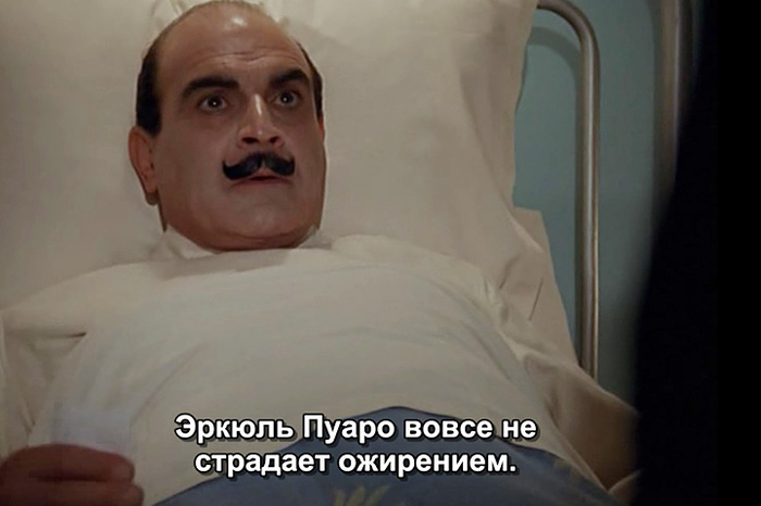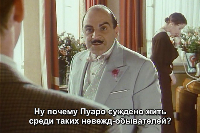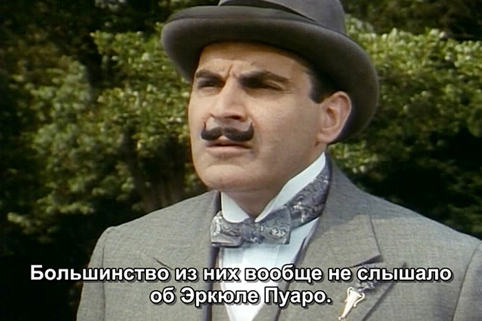 Обратите внимание на реплики с первых двух кадров, где изображён Суше. Такая связь получилась случайно. Но можно сказать, что как любой великой личности, даже Пуаро были свойственны противоречия в характере. Да и фраза с третьей реплики сюда тоже неплохо вписывается. Получился, даже мини-комикс. Остальные реплики - уже в разнобой.