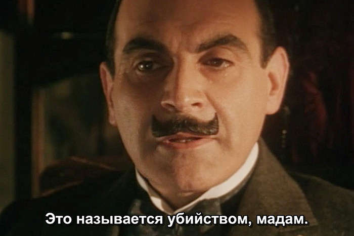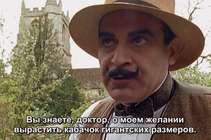 Знакомая, увидев как выглядит Пуаро из грядущей экранизации "Убийства в "Восточном Экспрессе"" Кеннета Браны в его же собственном исполнении, с апломбом заявила, что: "Усы ужас как бутафорские".