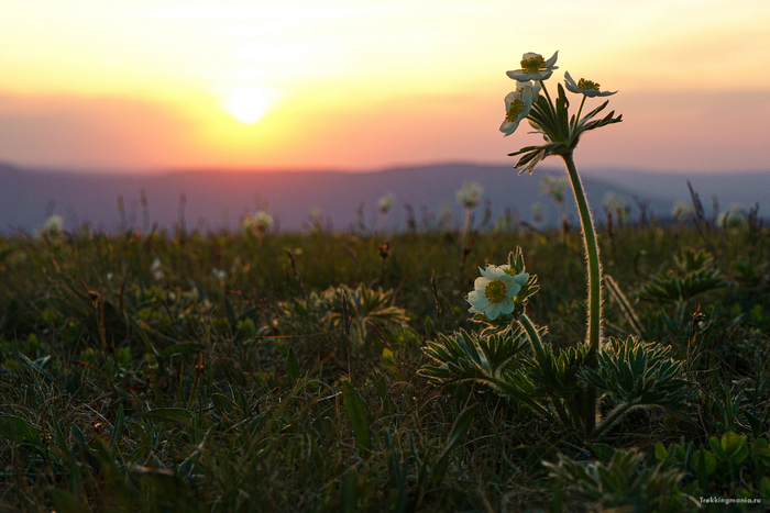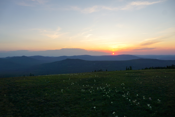 Немного побродив по вершине, спешим вниз. Обед в беседке на кордоне у Трёх вершин, собираем рюкзаки и в темпе идём на предвершинное плато у вершины Большого Нургуша. Примерно 9 км, и мы на месте ровно под закатное солнце. Ставим палатку и сразу спать, рабочий денёк получился, подустали. Утром встаём с первыми лучами и бегом на вершину, пьём кофе, завтракаем, затем возвращаемся к палатке и ещё часок лежим, пропуская пару дождевых тучек.