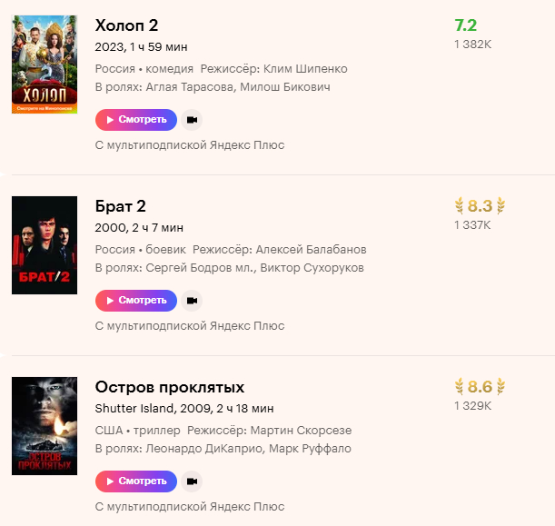Ладно культовый "Брат 2" или популярный "Остров проклятых", который вышел тогда, когда Кинопоиск был на пике ( хотя тут тоже больно много оценок и это явно фильм не для топ 10 по количеству зрителей). Удивляет "Холоп 2" на 8-й позиции, который обошел более качественную первую часть ( хотя ему вообще не место в топах, тк халтурный сиквел хорошей, но простой комедии, которых сотни).