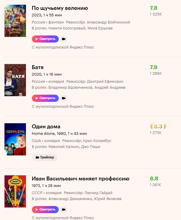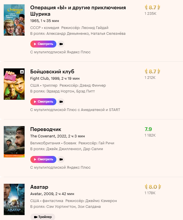 Далее на Кинопоиске - "По щучьему велению" (средняя сказка), "Батя" (средняя комедия), "Один дома" ( отличный фильм, но слишком уж он высоко, но сказывается официальное пребывание у нас везде до 2025-го), "Иван Васильевич меняет профессию" ( заслуженно в топе), "Операция Ы" (заслуженно), "Бойцовский клуб" (заслуженно, но есть накрутка как и у всего официального у нас), "Переводчик" ( на нормальных сайтах он не попадет и в топ 1000, а у нас обычный фильм в топ 20 по оценкам и сам рейтинг 7,9 из 10), "Аватар" ( + - на месте, тк его в свое время практически все видели и 1-я часть хороший блокбастер и вышел на пике жизни Кинопоиска).