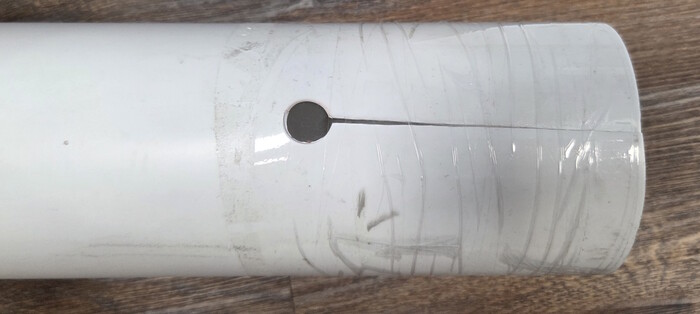 Внутренний диаметр фланца 96 мм, длина окружности 301.5 мм, наружный диаметр трубы 104мм, длина окружности 326.5мм, соответственно надо уменьшить длину окружности трубы на 25 мм, что я и сделал выполнив два треугольных пропила с основанием 12.5 мм и скрутив трубу скотчем.