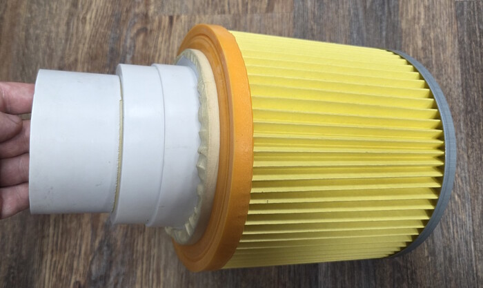 Так сошлись звёзды что у фильтра ZSF03P (https://lemanapro.ru/product/filtr-vozdushnyy-zugel-zsf03p-86339063/) который применяется в строительных пылесосах типа Dexter 20L и 30L посадочный диаметр ровно 150мм. И в том же Лемана Про есть ступенчатый переходник 80-150мм (https://lemanapro.ru/product/perehodnik-dlya-kruglyh-vozduhovodov-equation-d80-100-120-125-150-mm-plastik-18156062/) который позволяет идеально(ну почти, с подмоткой скотча) состыковать фильтр и вентилятор.