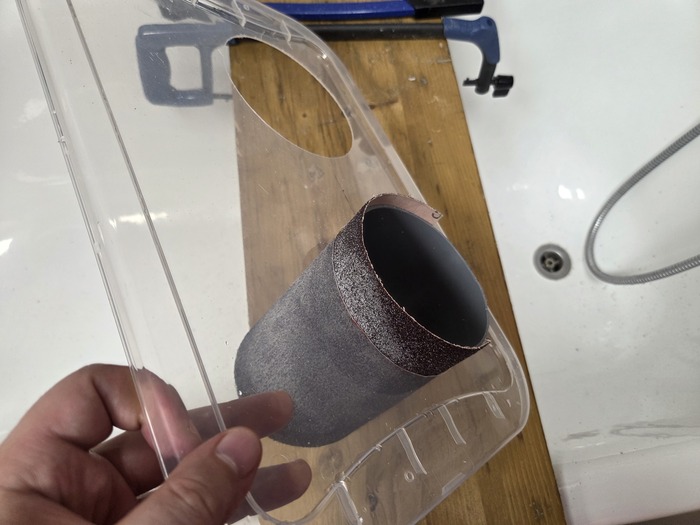 Отверстие в крышке вырезал канцелярским ножом и далее довёл крупной наждачной надетой на кусок трубы. Получилась плотная посадка которую я даже никак не стал герметизировать, просто вставил туда раструб а уже в него остальные трубы.