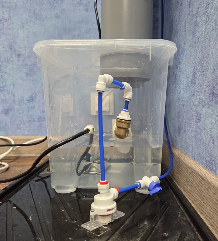Для второй версии я уже знал что хочу, а именно более компактный бак, все коммуникации с лицевой стороны, отсутствие ввода провода через крышку, также разместить уз модуль более удачно чтобы он меньше брызгал. Для второй версии я взял контейнер немного поменьше, а именно 38.9x28.6x27.5, да он более высокий, но это не важно. https://lemanapro.ru/product/yashchik-kristall-389x286x275-sm-22-l-plastik-s-kryshkoy-cvet-prozrachnyy-18421410/ Для того чтобы установить канализационные трубы в крышку ящика я купил две коротких трубы (15 см) и отпилил от них раструбы.