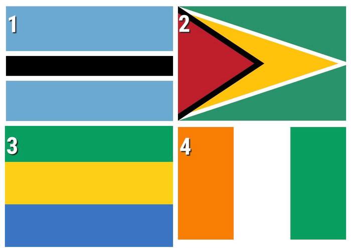 Правильный ответ: 2. Это флаг Гайаны, Южная Америка. 1 — Ботсвана. 3 — Габон. 4 — не Ирландия, а Кот-д’Ивуар.