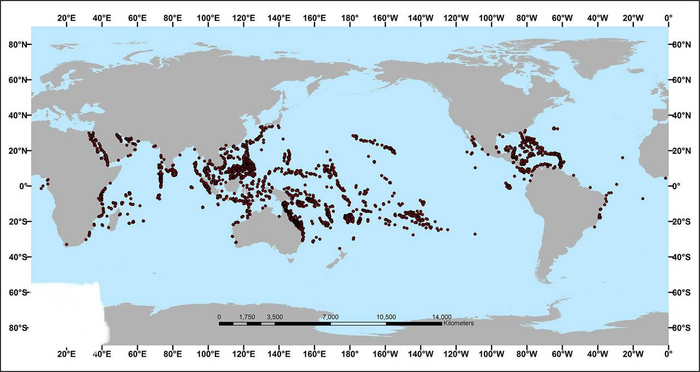 Правильный ответ: 2. Это карта коралловых рифов. Океания, Ю-В Азия и восточно побережье Австралии намекает. Там почти половина всех известных коралловых рифов.