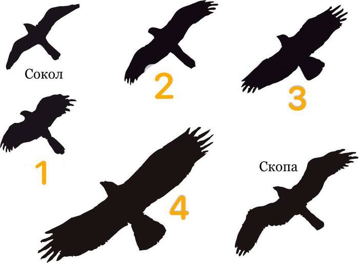 Ответ: канюк по силуэту похож на орла, но меньше. Он под цифрой 3. Конечно это общая схема, даже без указаний вида.