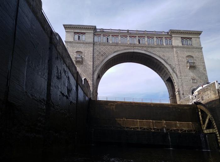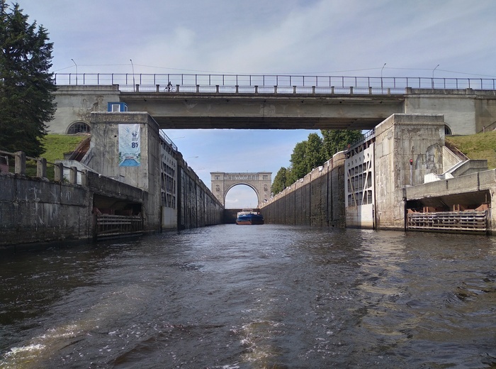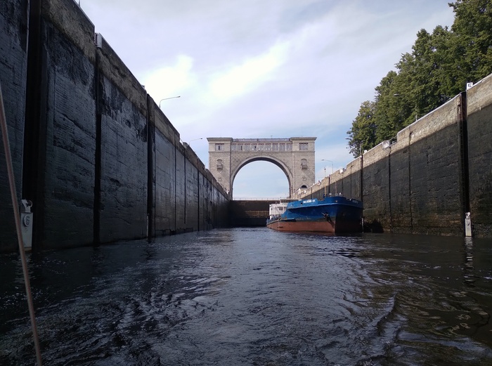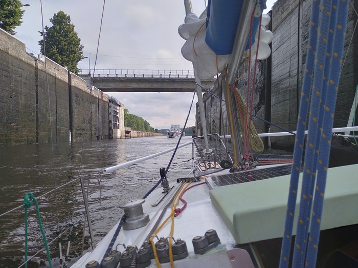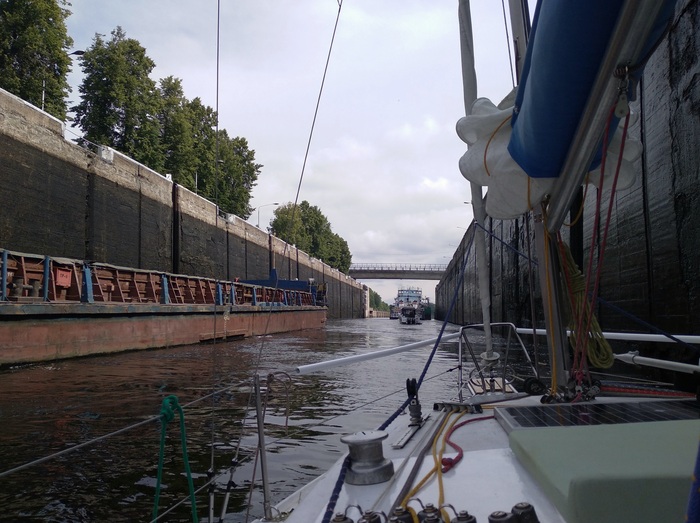 Заходим в камеру последними, начинается суета - что-то у "Окского" идет не по плану, и он никак не может ошвартоваться. Девушка-диспетчер выгоняет нас из камеры, чтобы не мешались большим железным пароходам. Ждем повторного приглашения, которое вскоре и получаем. Быстро швартуемся. В последний момент заходит еще моторный катер, ждем, пока ошвартуется и он. Шлюзовка проходит спокойно, но по ее окончанию меняют порядок выхода, и мы выходим перед "Окским".